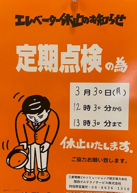 3月30日(月)12時30分から13時30分までエレベーター定期点検で休止いたします。