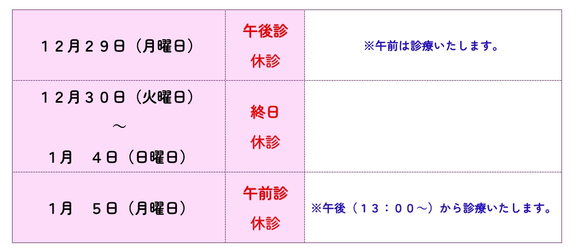 上記の期間を年末年始の休診とさせて頂きます。お手元のお薬をご確認いただき、余裕を持ってご受診ください。